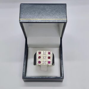 Diseño Exclusivo: Presenta una cabeza cuadrada audaz y moderna, con un engaste de nueve piedras preciosas dispuestas en un patrón de rejilla (3×3).